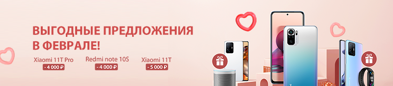 Скидки на смартфоны и подарки накануне Дня всех влюбленных. Порадуйте себя и вашу вторую половинку! — Приобретая Xiaomi 11T, вы получаете Smart Band 6 в подарок. — Приобретая Xiaomi 11T Pro, вы получаете Smart Speaker в подарок. Акция длится с 11 по 28 февраля.