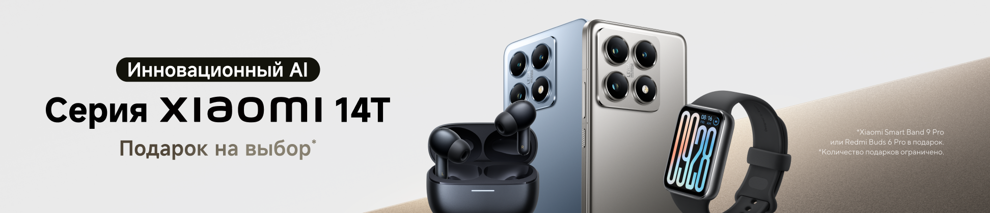 При покупке Xiaomi 14T/14T Pro — фитнес-браслет Xiaomi Smart Band 9 Pro или наушники Redmi Buds 6 Pro в подарок на выбор!